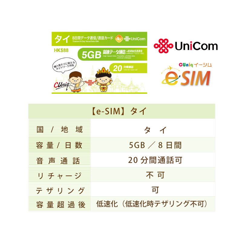 【タイ】5GB8日 データ通信(音声通話付) プリペイドeSIM