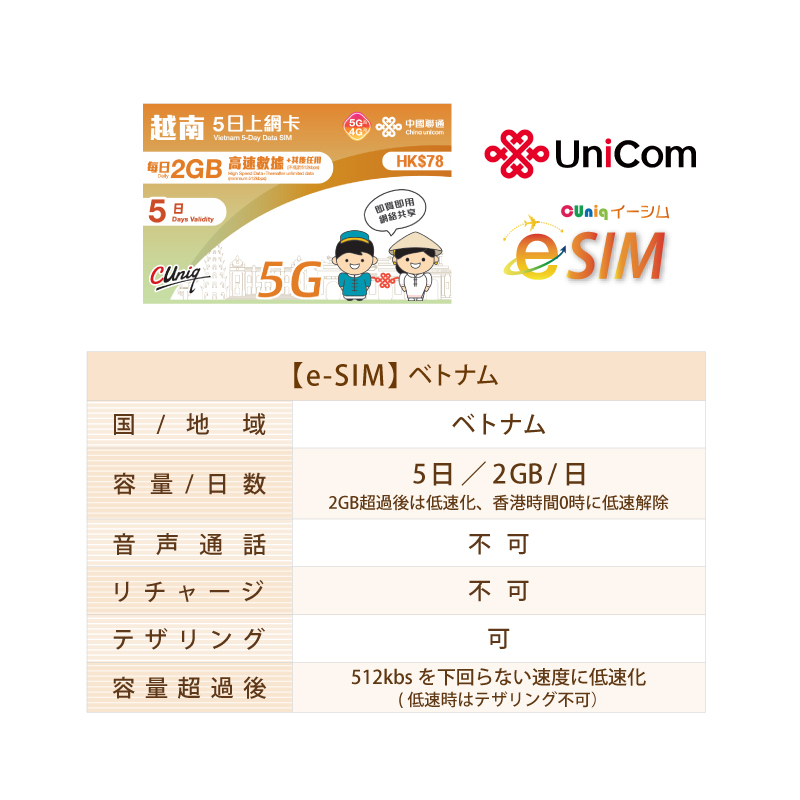 【ベトナム】2GB/日 5日 データ専用 プリペイドeSIM