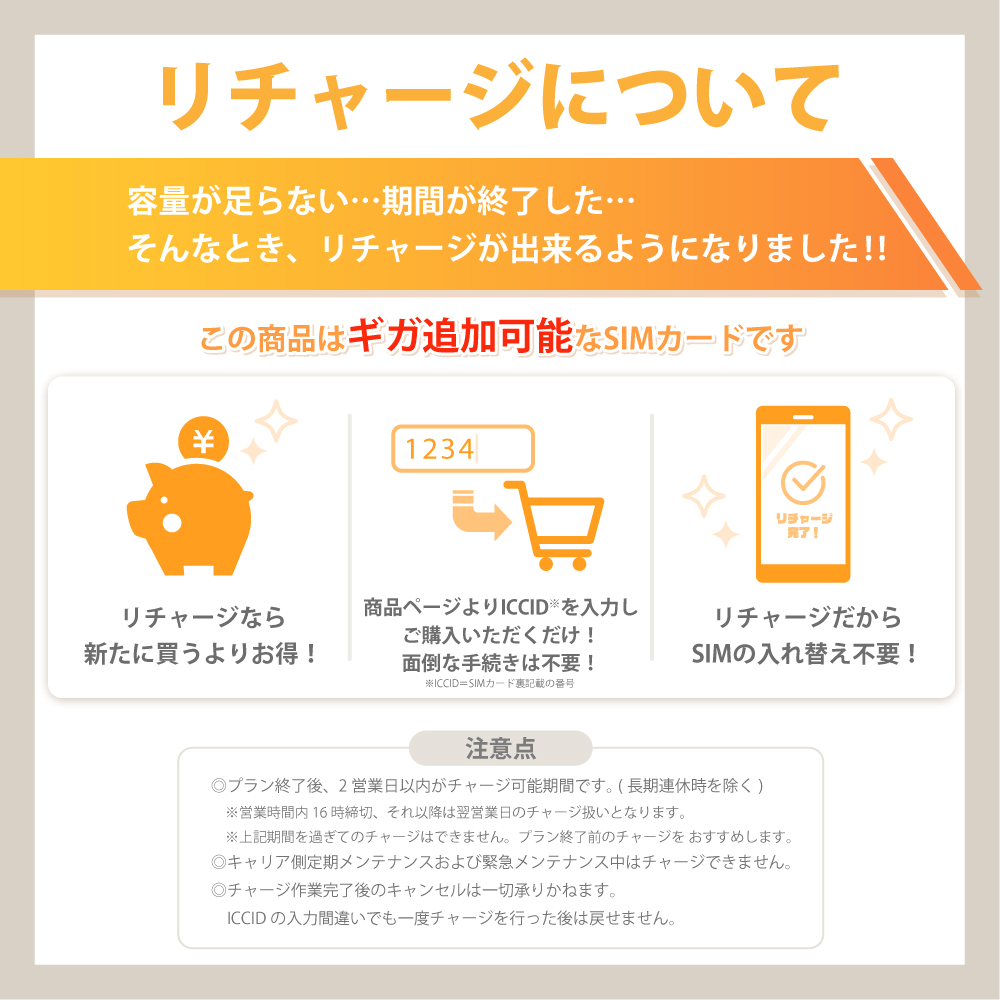 | リチャージ | 可能(プラン終了前、もしくはプラン終了後2営業日以内) こちらからご確認ご注文ください |