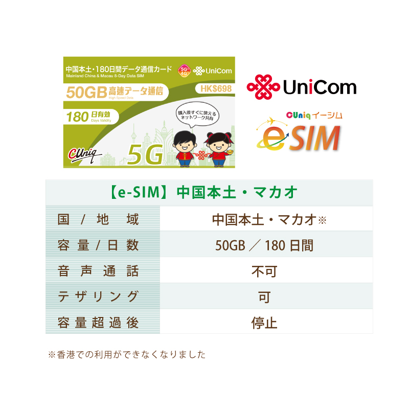 不課税【eSIM/メール納品】中国/マカオ 50GB180日 データ専用 プリペイドeSIM ChinaUnicom ※※eSIMにつき5%OFF※※ [eSIM-CU180day50gb]