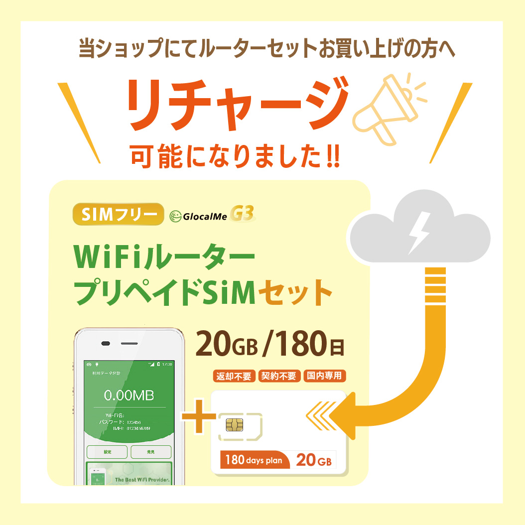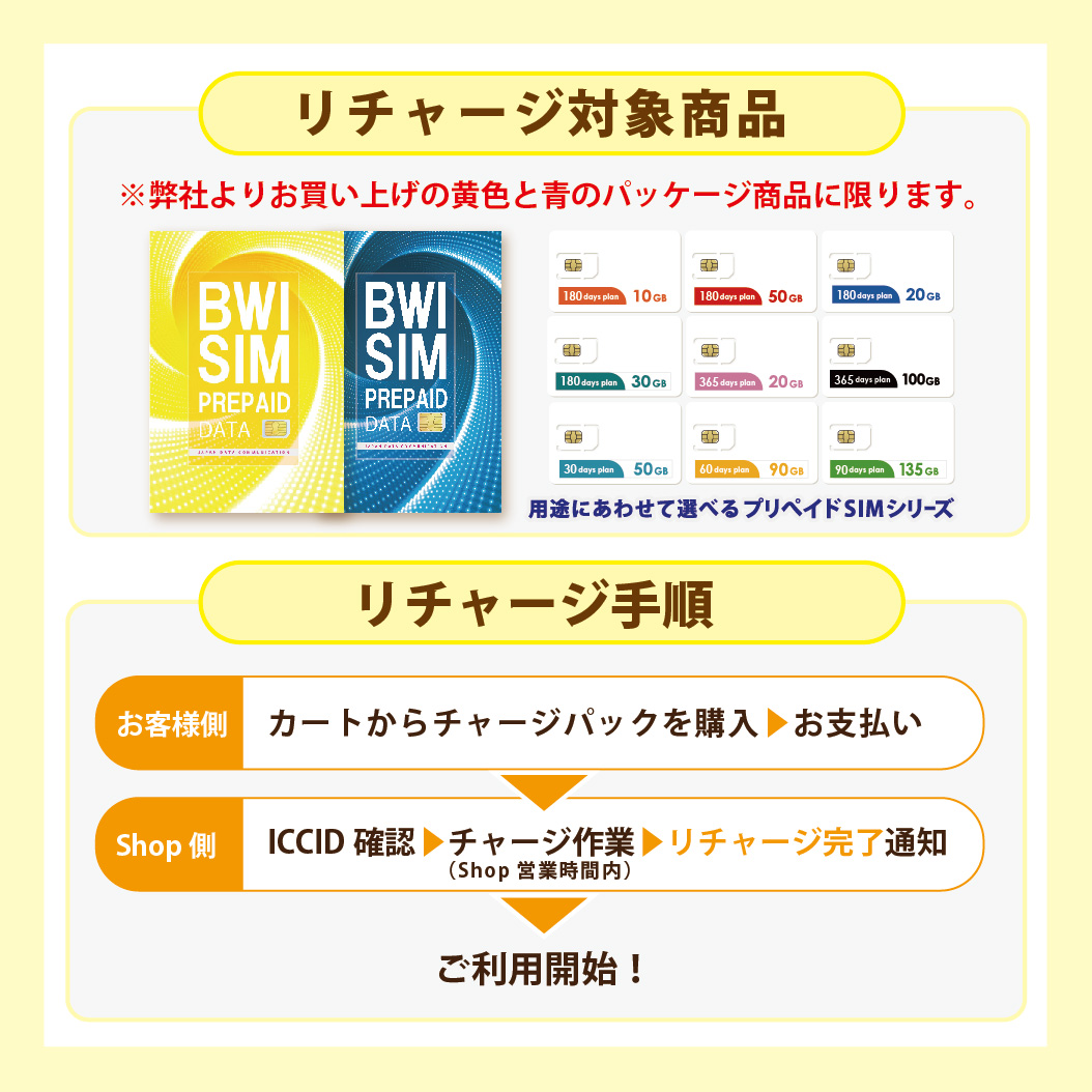 | 対象商品 | 弊社販売の黄色と青のパッケージ【docomoMVNO回線物理SIM】のみ ※弊社販売品でも他商品にはリチャージ出来ません。 |