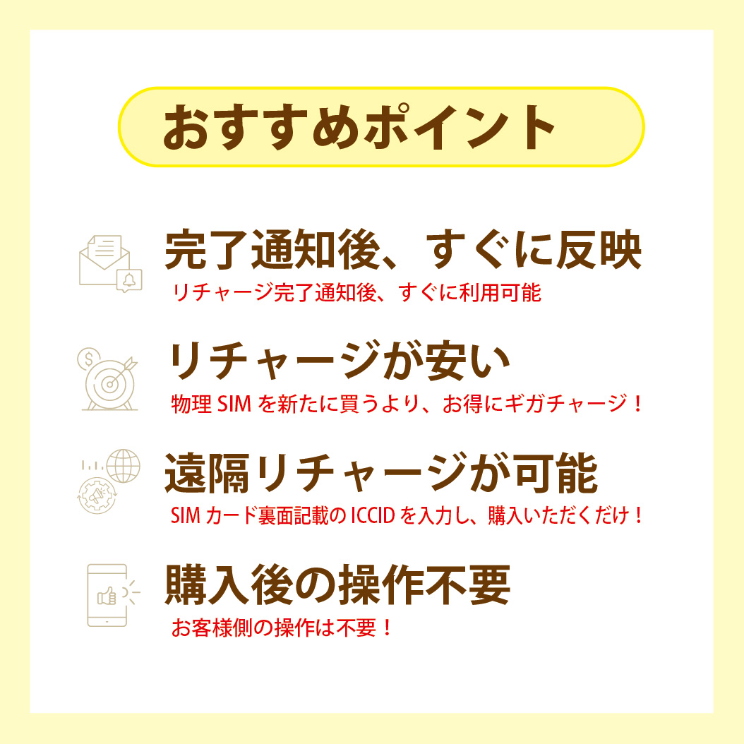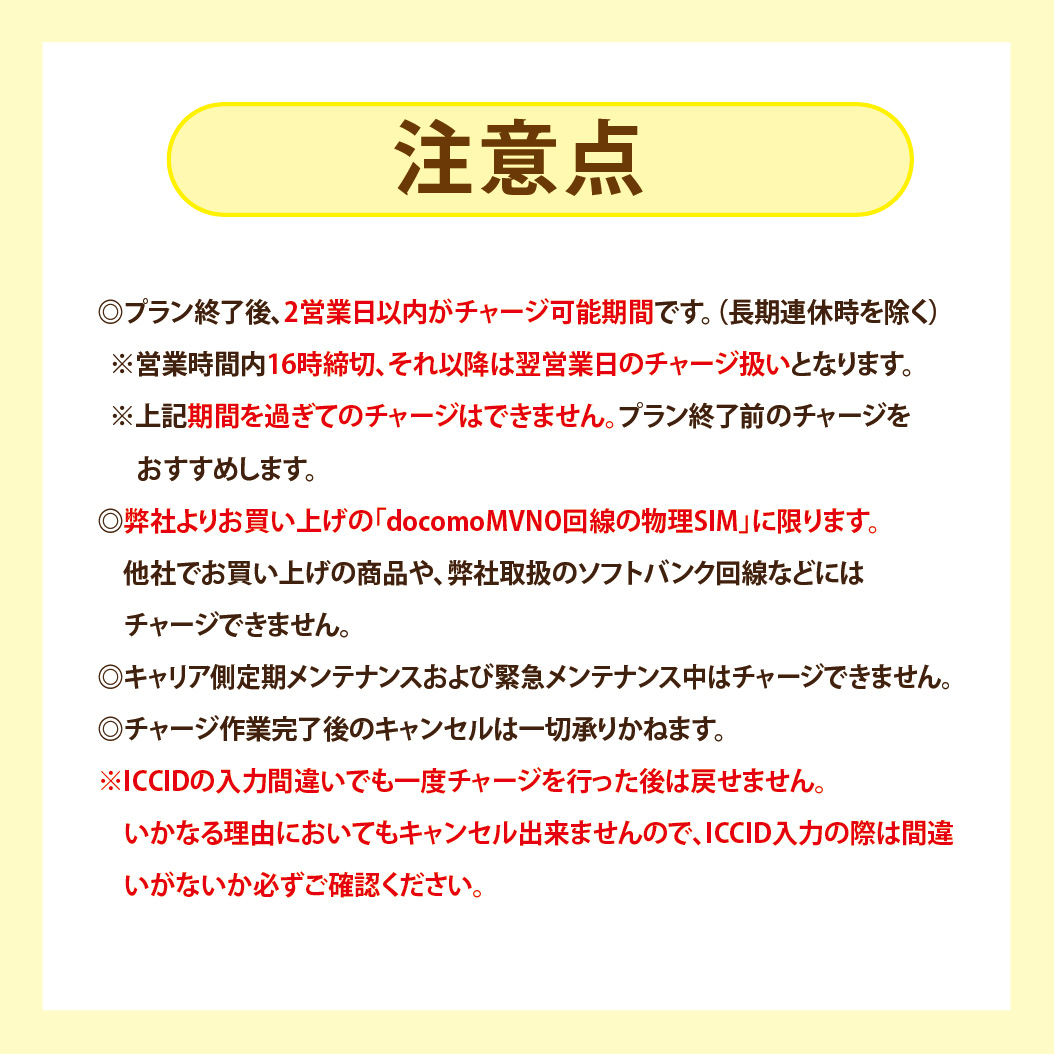 | 注意事項 | ※こちらは実際に商品をお届けするものでは御座いません。チャージ完了時はメールにてお知らせいたします。 ※弊社からご購入いただいた黄色と青のパッケージ【docomoMVNO回線物理SIM】のみが対象です。他社でのご購入品や弊社販売の他商品にはリチャージ出来ませんのでご了承ください。 ※ご注文後、弊社にてICCIDを確認し、対象販売品でないと判断させた場合にはご注文をキャンセルとさせていただきます。 ※また、商品の発送が無い為「代引き」には対応しておりません。ご注文時「代引き」をご選択いただいた場合もご注文をキャンセルとさせていただきます。 ※ご注文時は備考欄に必ず「ICCID」のご入力をお願い致します。ご入力が無い場合にはお電話やメールにて確認の連絡をさせていただく場合がございます。 ※「ICCID」は正確にご入力下さい。誤ると違うSIMにリチャージしてしまい戻すことが出来ません。 いかなる理由においてもチャージ後のキャンセルなども出来かねますのでご了承ください。 ※元々のプラン終了後、2営業日以内のSIMが対象となります。 期間を過ぎるとリチャージ出来なくなりますのでご注意ください。(プラン終了前のリチャージをおすすめします) ※リチャージ操作締め切りは営業日内16時です。この時間までに決済確認が取れたご注文は当日中にリチャージいたします。 それ以降は営業日対応となり、リチャージ可能期間、間近の場合にはご注意ください。(プラン終了目のリチャージをおすすめします) |
