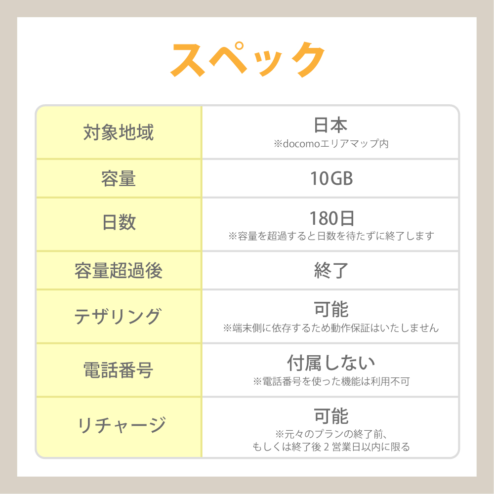 | 有効期限 | 通電日より180日間 ※※最終通信確認日より60日程度ご利用がない場合には180日OR10GBを超えずとも予告なく終了停止致します。 |