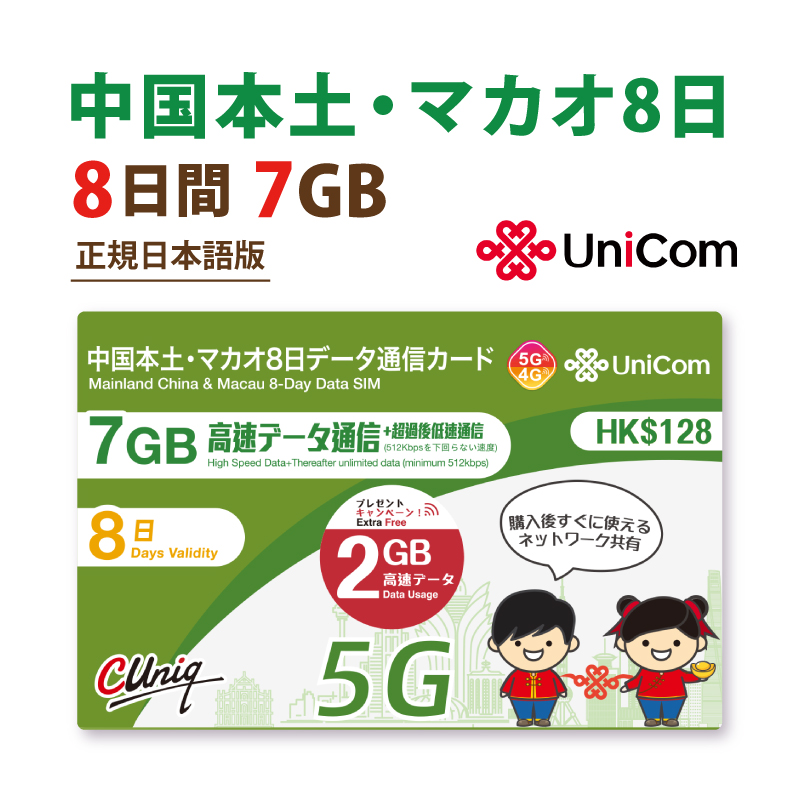 不課税【物理SIM/ネコポスゆうパケット発送】China Unicom HK 中国/マカオ データ通信専用 プリペイドSIMカード(7GB+2GB※/8日) [SIM-cm7gb8d]