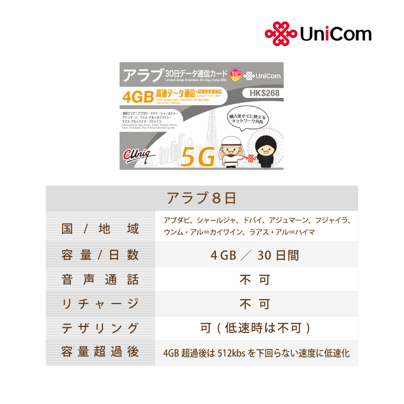 不課税【物理SIM/ネコポスゆうパケット発送】China Unicom HK アラブ首長国連邦 データ通信専用 プリペイドSIMカード 30日 4GB
