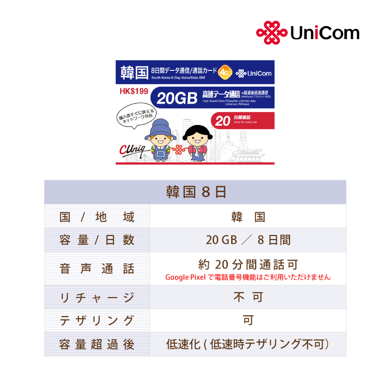 不課税【物理SIM/ネコポスゆうパケット発送】韓国 China Unicom 8日 データ通信+音声通話付きSIM (20GB/8日) [SIM-ko20gb8d]